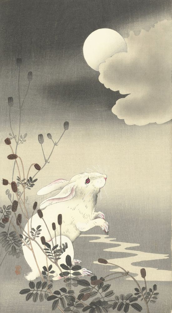 rabbitmoonclovercloudsrabbitmooncloverwoodblock printJapanese artUkiyo-evintageetherealtranquilnature