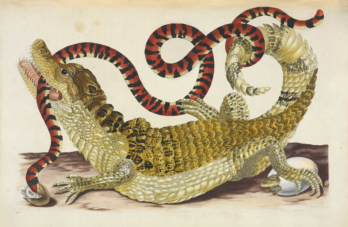 This is a detailed watercolor painting of a crocodile with a snake coiled around it. The crocodile is depicted lying on a surface that appears to be a wooden table or ledge. Its body is covered in intricate scales, rendered in shades of brown, tan, and gold, creating a textured effect. The crocodile's head is open, revealing a pink mouth and teeth. A vibrant red and black striped snake is coiled around the crocodile's body, adding a striking contrast to the reptile's earthy tones. The snake's head is near the crocodile's open mouth, as if it is interacting with it. To the right of the crocodile, there is a large, speckled egg, suggesting a theme of reproduction or life cycle. The background is a soft, off-white color, which helps to emphasize the details of the reptiles and the egg. The overall style of the painting is realistic and detailed, with a focus on capturing the textures and patterns of the reptiles' skin.